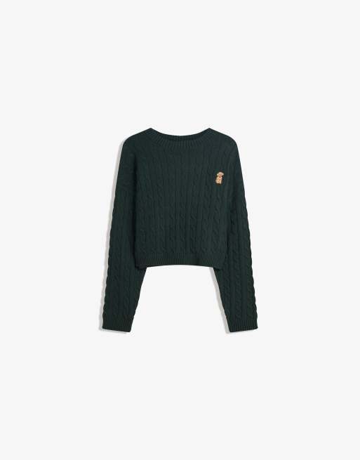 Bershka Embroidered cable-knit sweater in green