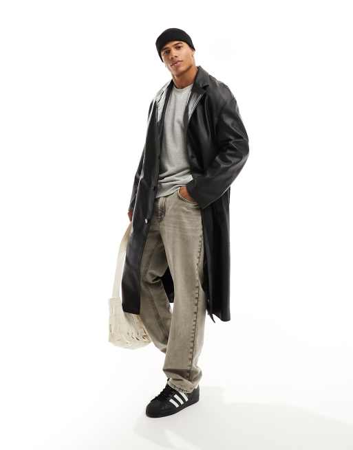Bershka faux leather trench coat in black