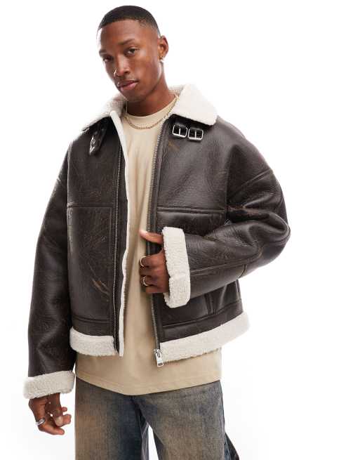 Bershka faux leather washed jacket with shearling in brown