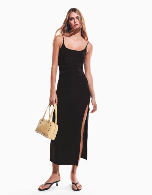 Bershka Gathered strap midi dress in black