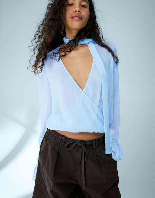 Bershka Long sleeve crossover scarf blouse in light yellow