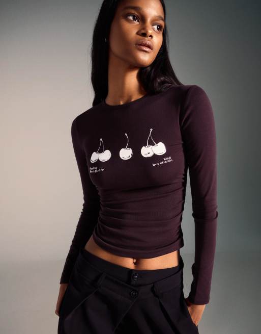 Bershka Long sleeve ruched print t-shirt in burgundy