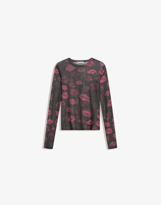 Bershka Long sleeve tulle print t-shirt in black