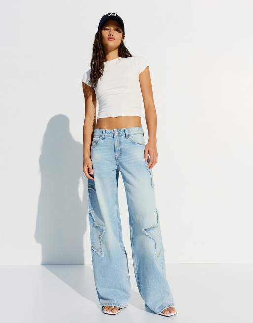 Bershka Low-rise boyfriend jeans with stars in mid blue