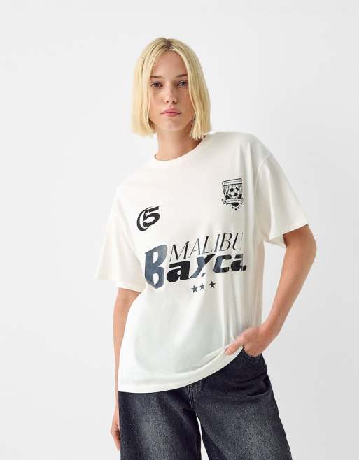 Bershka oversized 'Malibu' graphic football tee in ecru
