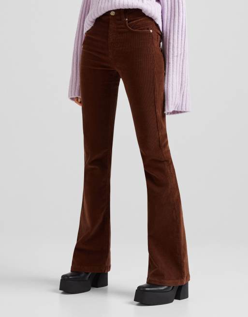 Bershka Petite slim leg cord trouser in brown