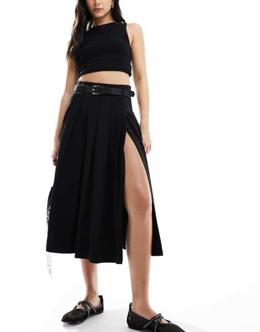 Bershka pleated tailored midi skirt with belt in black