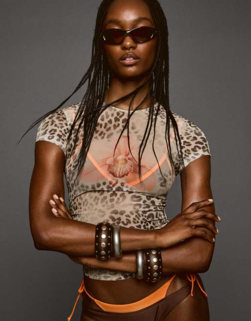 Bershka printed short sleeve tulle t-shirt in camel