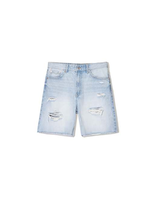 Bershka ripped denim bermuda shorts in light bue