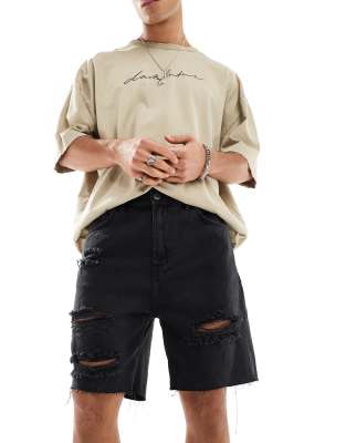 Bershka ripped denim short in black