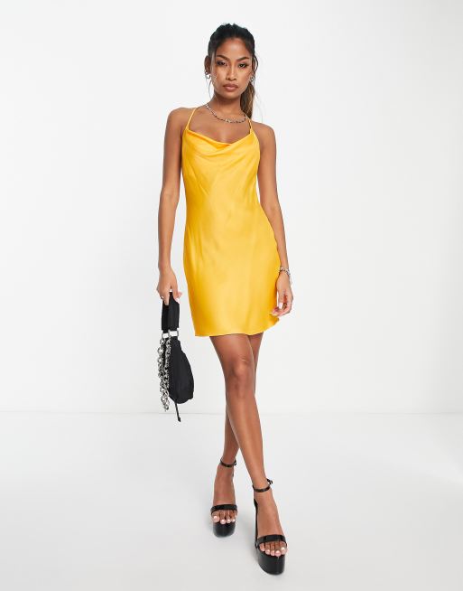 Bershka ruched side cowl neck satin mini dress in yellow