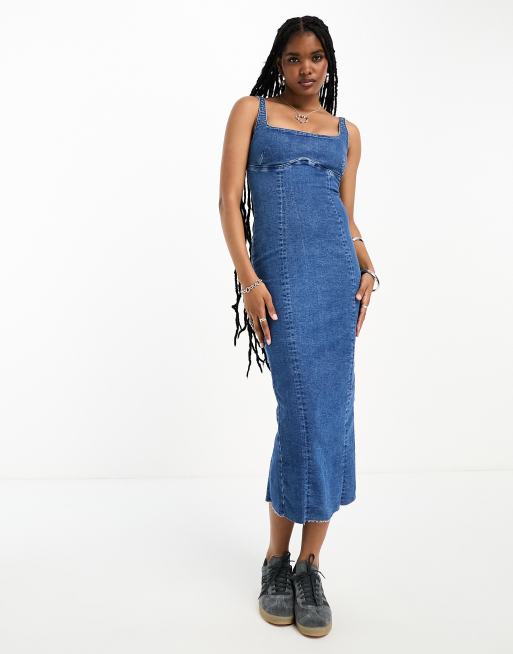 Bershka scoop neck denim bodycon midi dress in mid blue