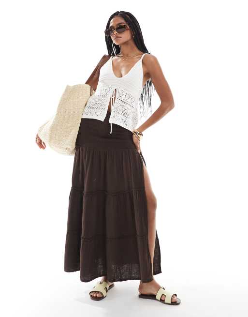 Bershka shirred waist tiered maxi skirt in brown