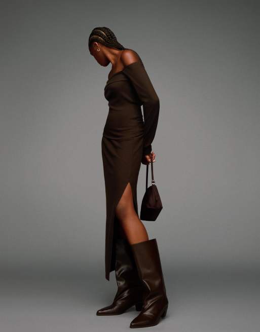Bershka Soft knit midi skirt in brown