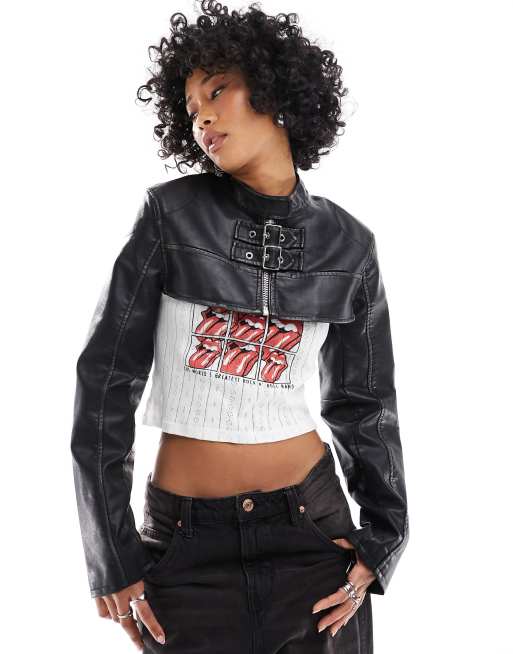 Bershka ultra cropped faux leather biker jacket in black