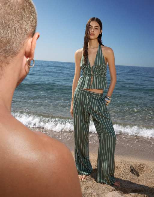 Bershka Wide-leg trousers with pleats in green