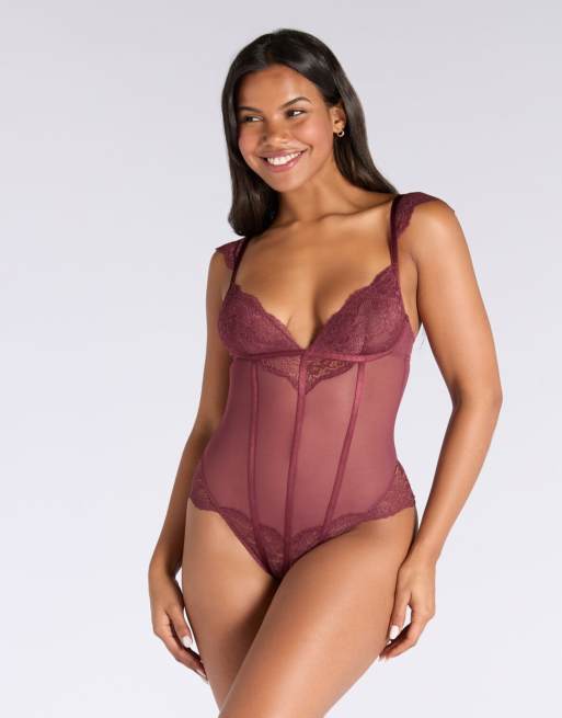 Boux Avenue Frida lace and sheer mesh unpadded bodysuit in oxblood
