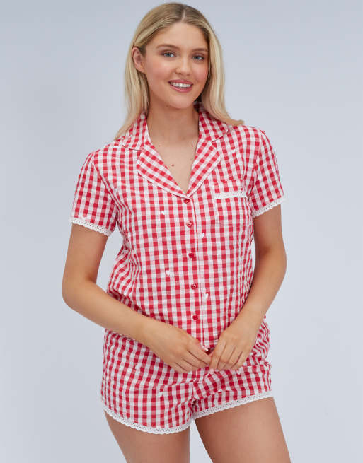 Boux Avenue gingham short pyjama set cotton collared top and shorts in red mix