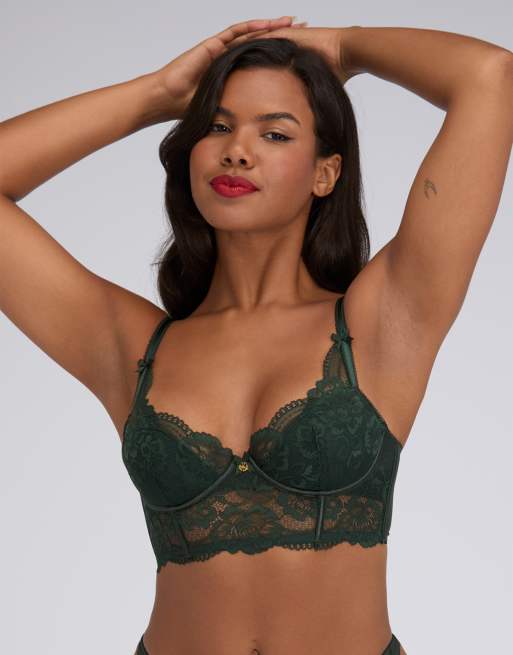 Boux Avenue Wren lace padded longline balconette bra underwired lingerie in bottle green