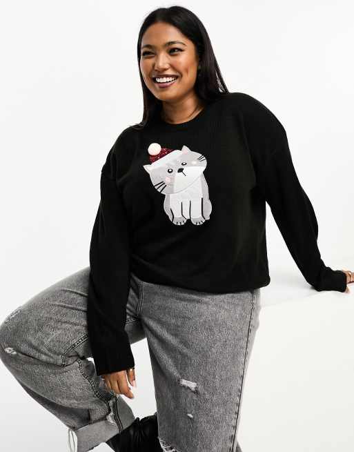 Brave Soul Plus cat christmas jumper in black
