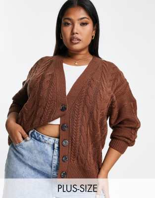 Brave Soul Plus jenner longline cable knit cardigan in brown