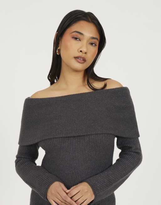 Brave Soul Bardot ribbed knit mini dress in charcoal