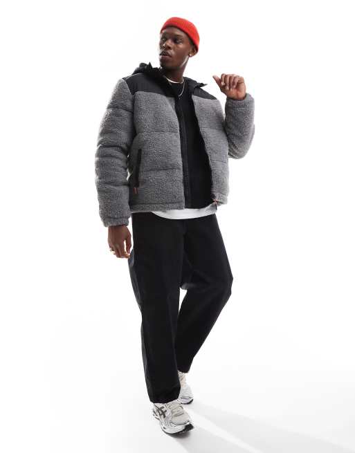 Brave Soul borg puffer jacket with contrast fabric in grey