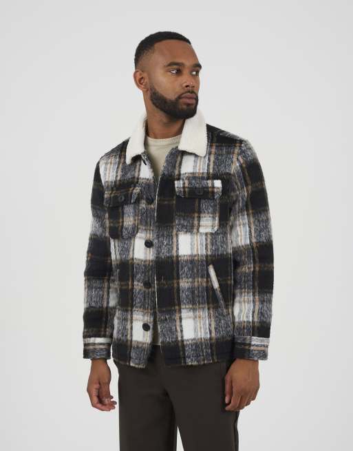 Brave Soul Brushed check jacket with sherpa collar in black