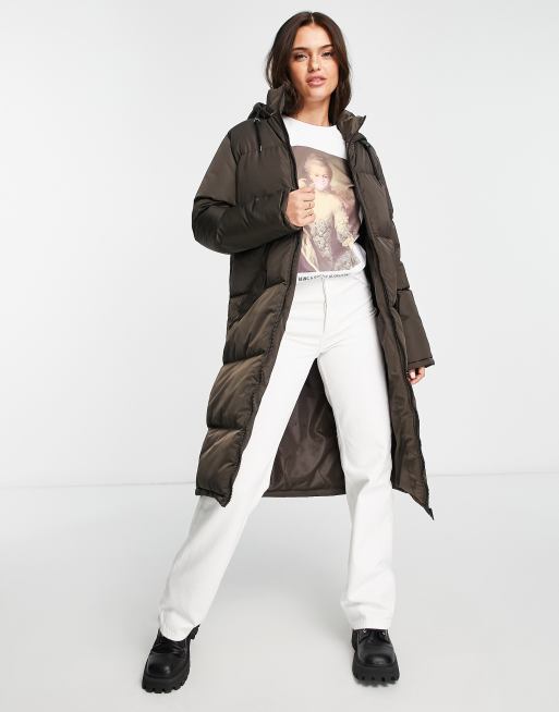 Brave Soul cello maxi longline puffer coat in chocolate brown