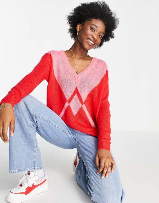 Brave Soul chevron colour block v neck jumper in red