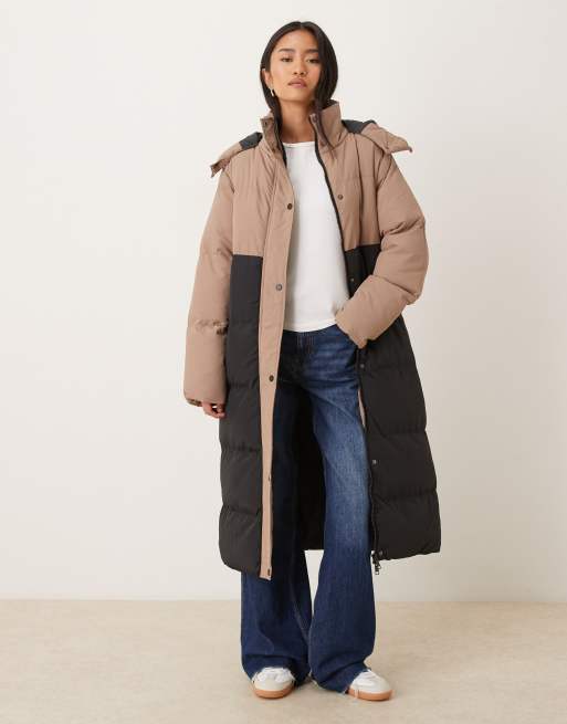 Brave Soul Colourblock maxi hooded puffer jacket in tan