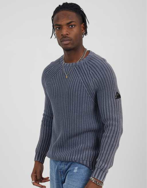 Brave Soul Cotton crew neck acid wash rib knit jumper in mid blue