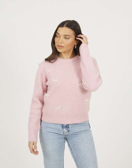 Brave Soul Crew neck jumper with jewel bow detail in pink