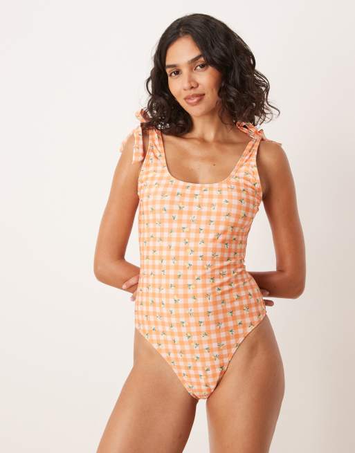 Brave Soul Gingham scoop neck swimsuit in orange
