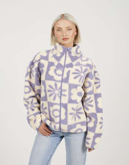 Brave Soul Graphic flower print zip through sherpa fleece in lilac
