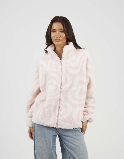 Brave Soul Graphic heart print zip through sherpa fleece in pale pink