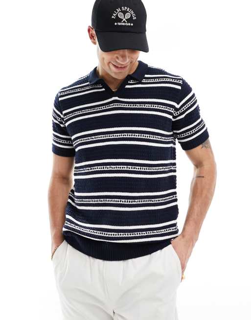 Brave Soul heavyweight textured knit trophy neck polo in navy stripe