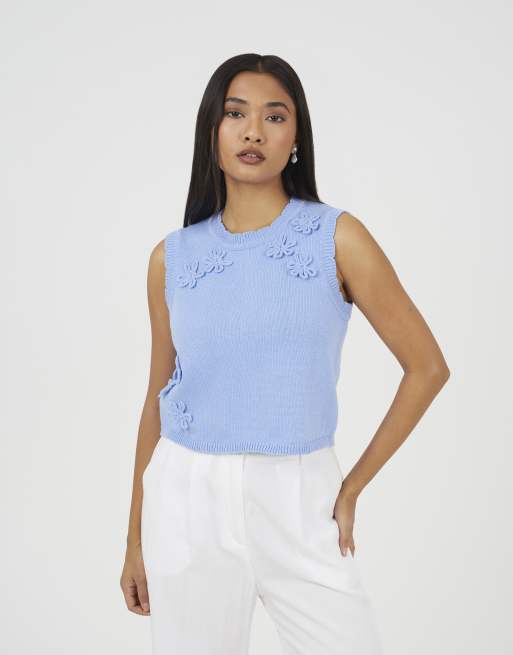 Brave Soul Knitted crew neck tank with crochet flowers in blue