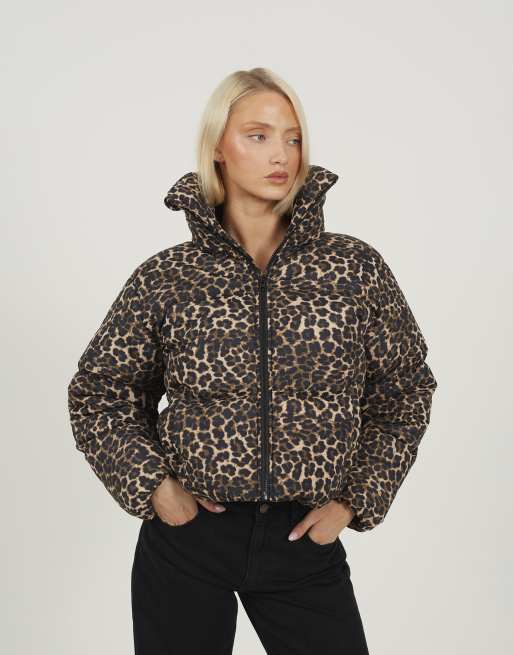 Brave Soul Leopard print short puffer jacket with oversized collar in brown