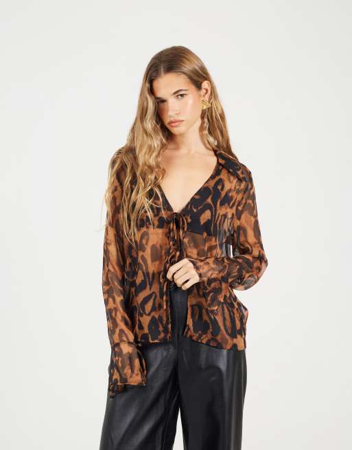Brave Soul Leopard print tie front blouse in brown