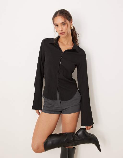 Brave Soul Long sleeve button through collared blouse in black