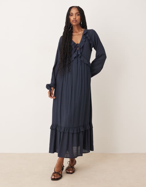 Brave Soul Long sleeve maxi dress with frill detail in navy
