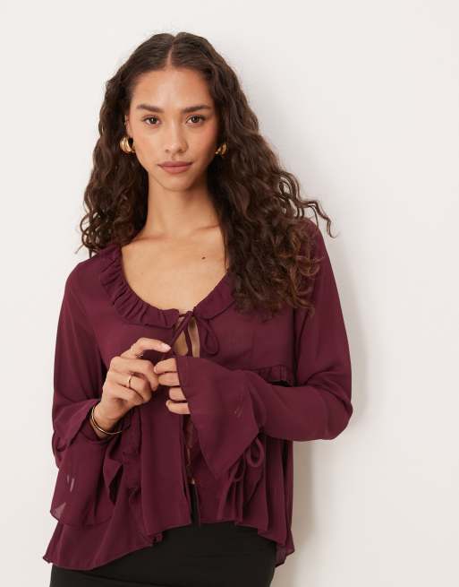 Brave Soul Long sleeve mesh ruffle tie front blouse in burgundy