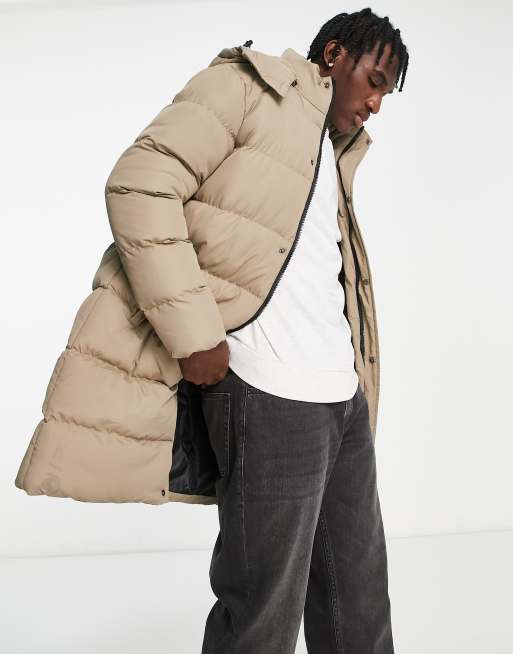 Brave Soul longline puffer coat with detachable hood in stone