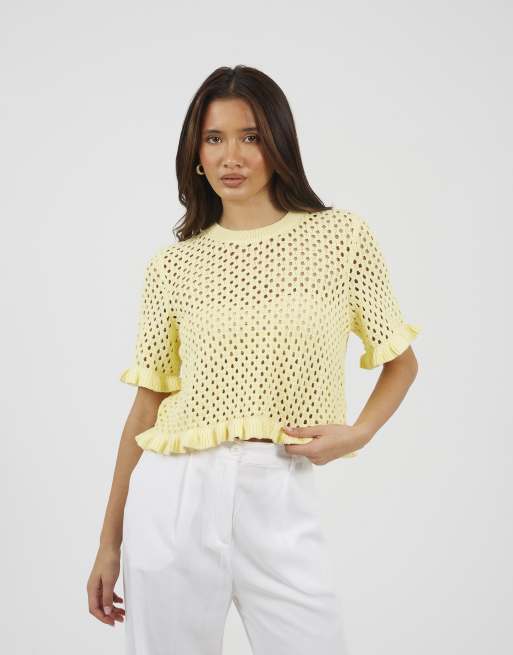 Brave Soul Open knit t shirt with frill hem in yellow