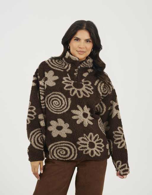 Brave Soul Quarter zip flower print sherpa fleece in chocolate