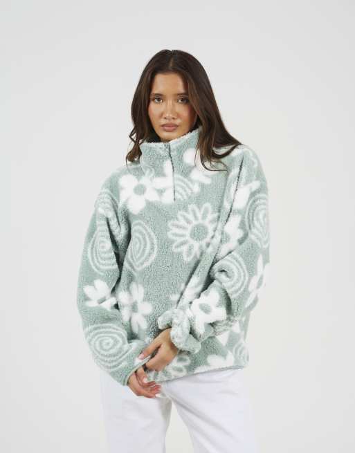 Brave Soul Quarter zip flower print sherpa fleece in mint