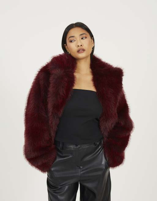 Brave Soul Revere collar short faux fur jacket in burgundy