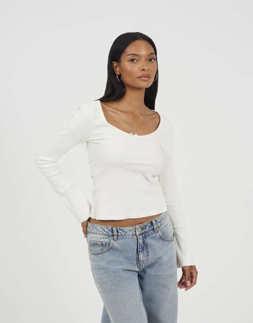 Brave Soul Ribbed scoop neck top with lettuce hem in cream