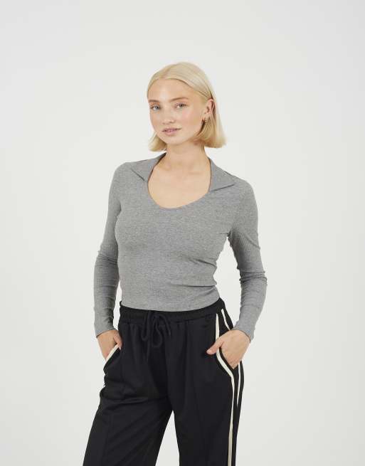 Brave Soul Ribbed v-neck collared top in grey